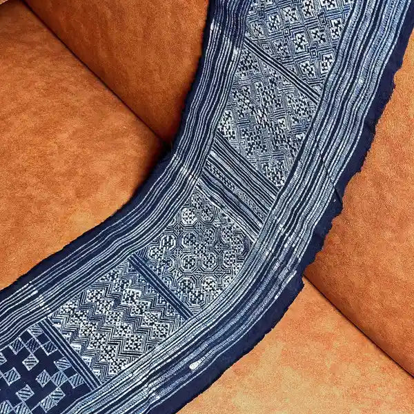 This fabric was a part of an authentic skirt of H'mong women in Mu Cang Chai, Vietnam. It is crafted on cotton by skilled H'mong women. Unlike mass-produced fabrics, this fabric has been lovingly used over time, lending it a uniquely soft texture that only adds to its charm.