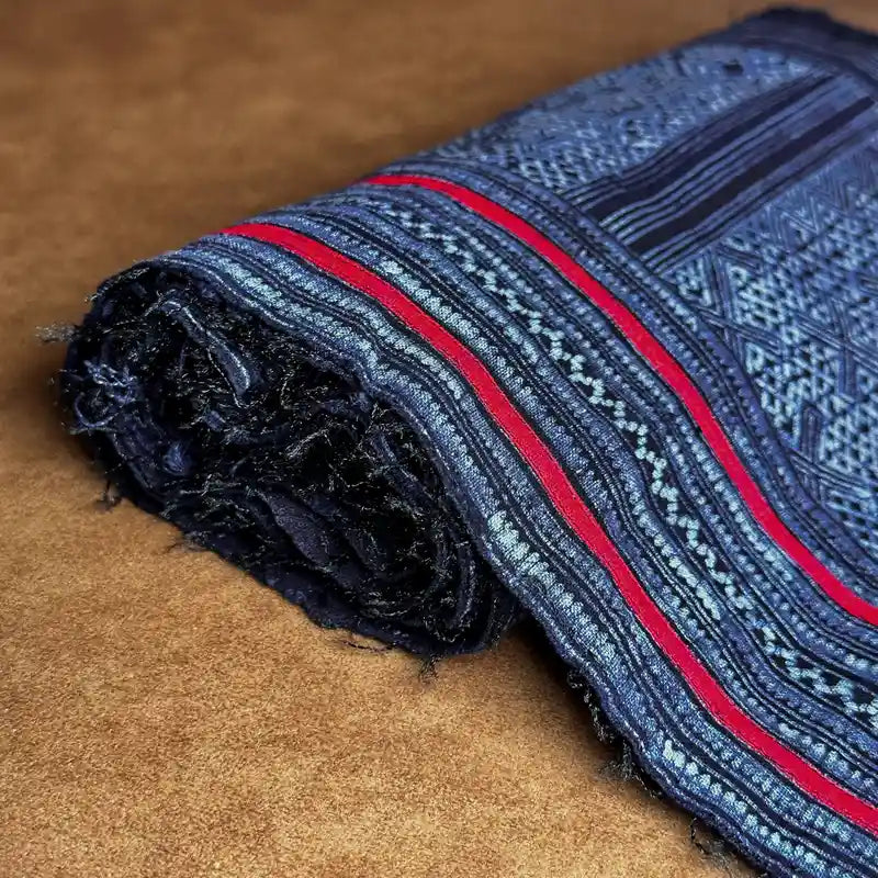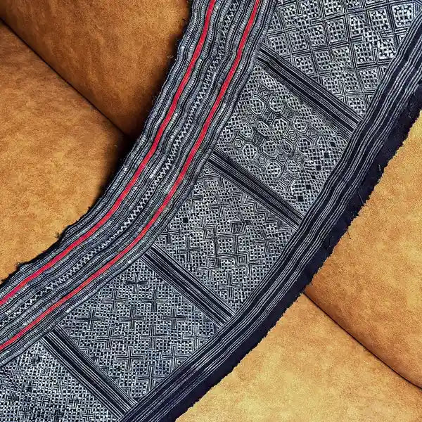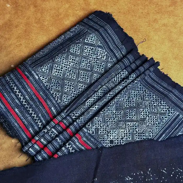 This fabric was a part of an authentic skirt of H'mong women in Mu Cang Chai, Vietnam. It is crafted on cotton by skilled H'mong women. Unlike mass-produced fabrics, this fabric has been lovingly used over time, lending it a uniquely soft texture that only adds to its charm.