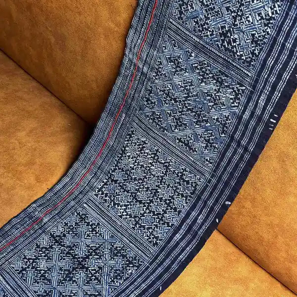This fabric was a part of an authentic skirt of H'mong women in Mu Cang Chai, Vietnam. It is crafted on cotton by skilled H'mong women. Unlike mass-produced fabrics, this fabric has been lovingly used over time, lending it a uniquely soft texture that only adds to its charm.