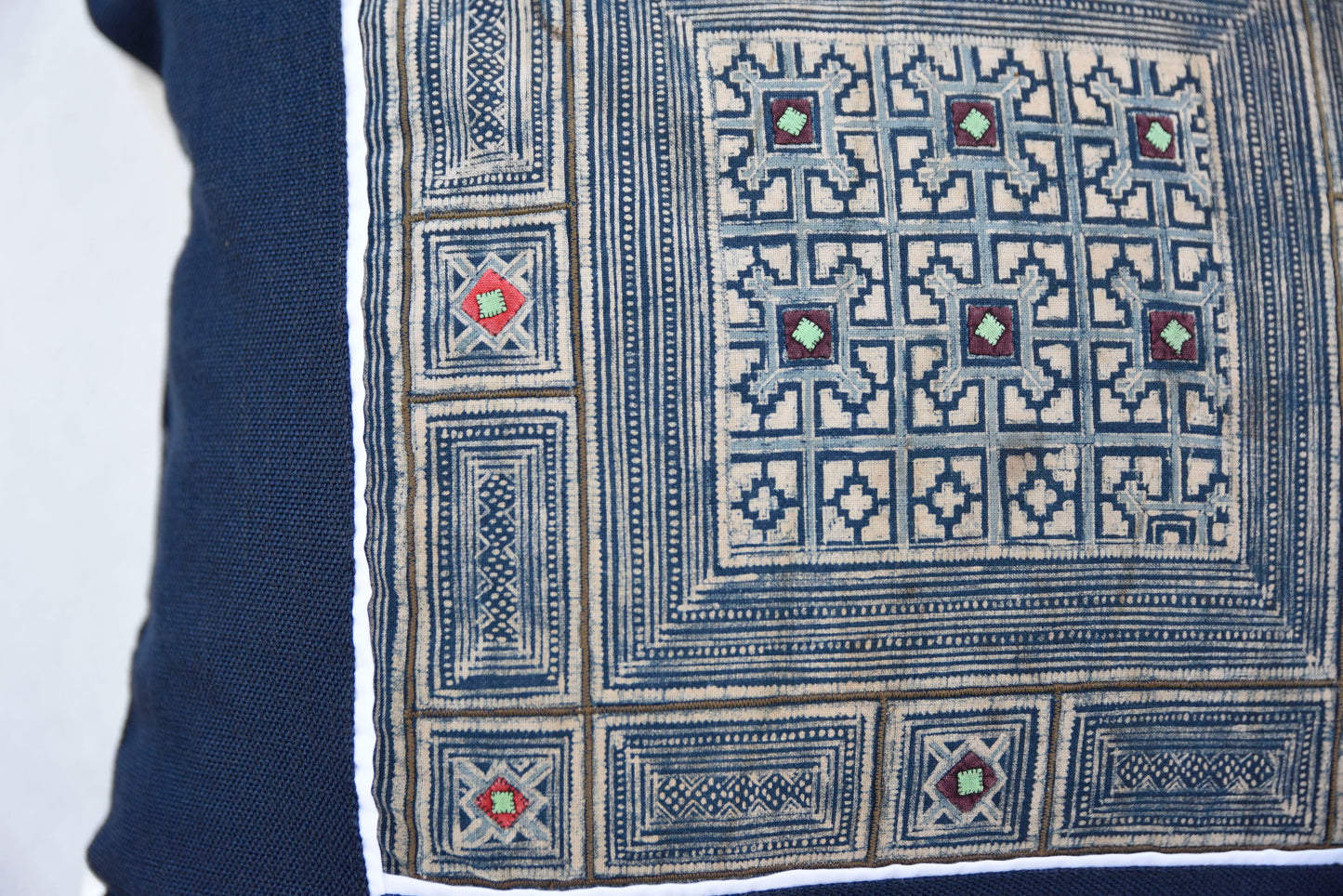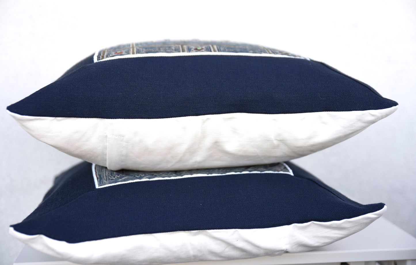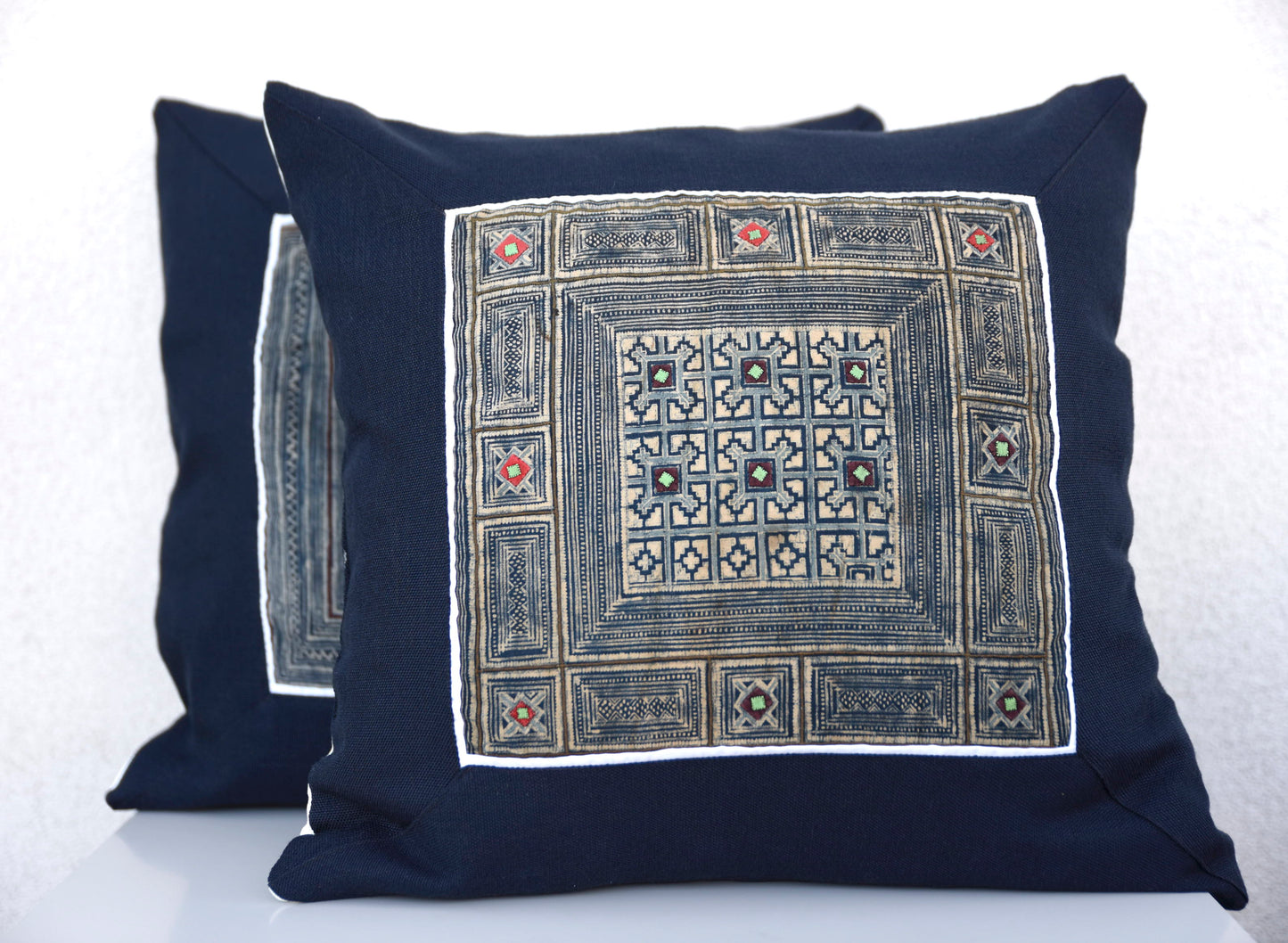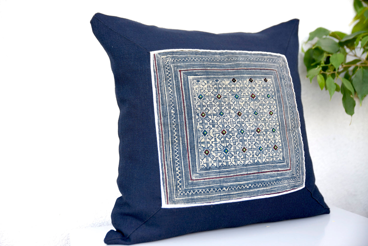 Marinblå kuddfodral, H'mong vintage tyg, batikmålningsmönster