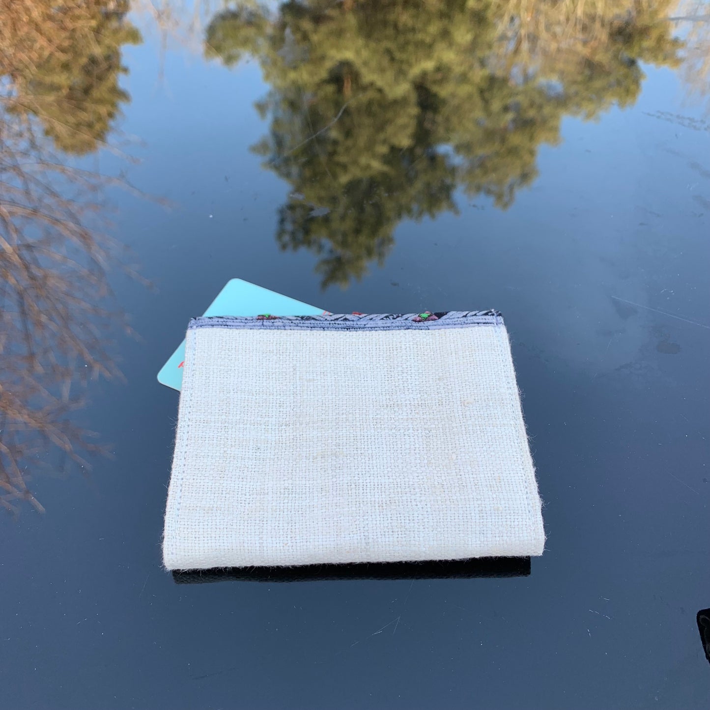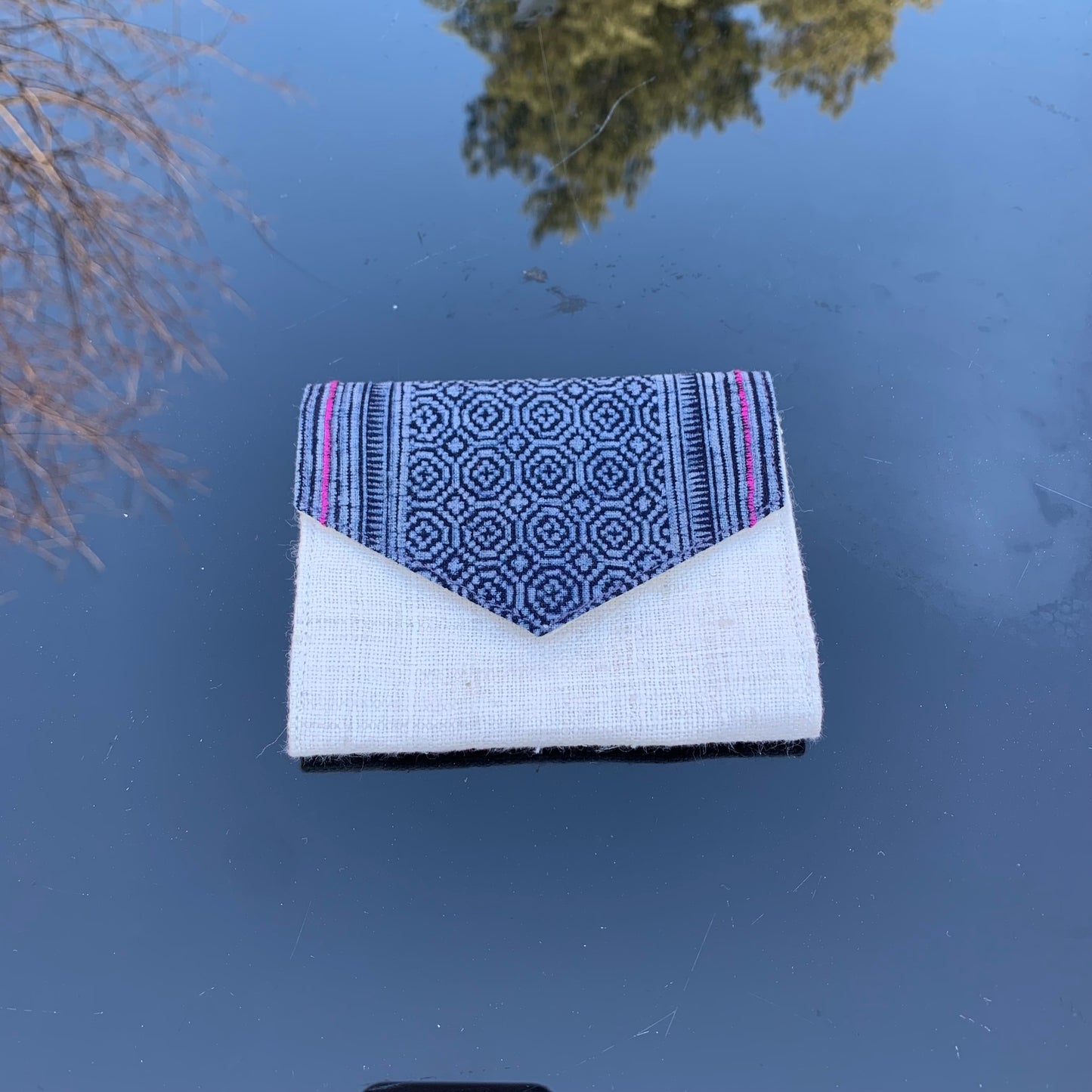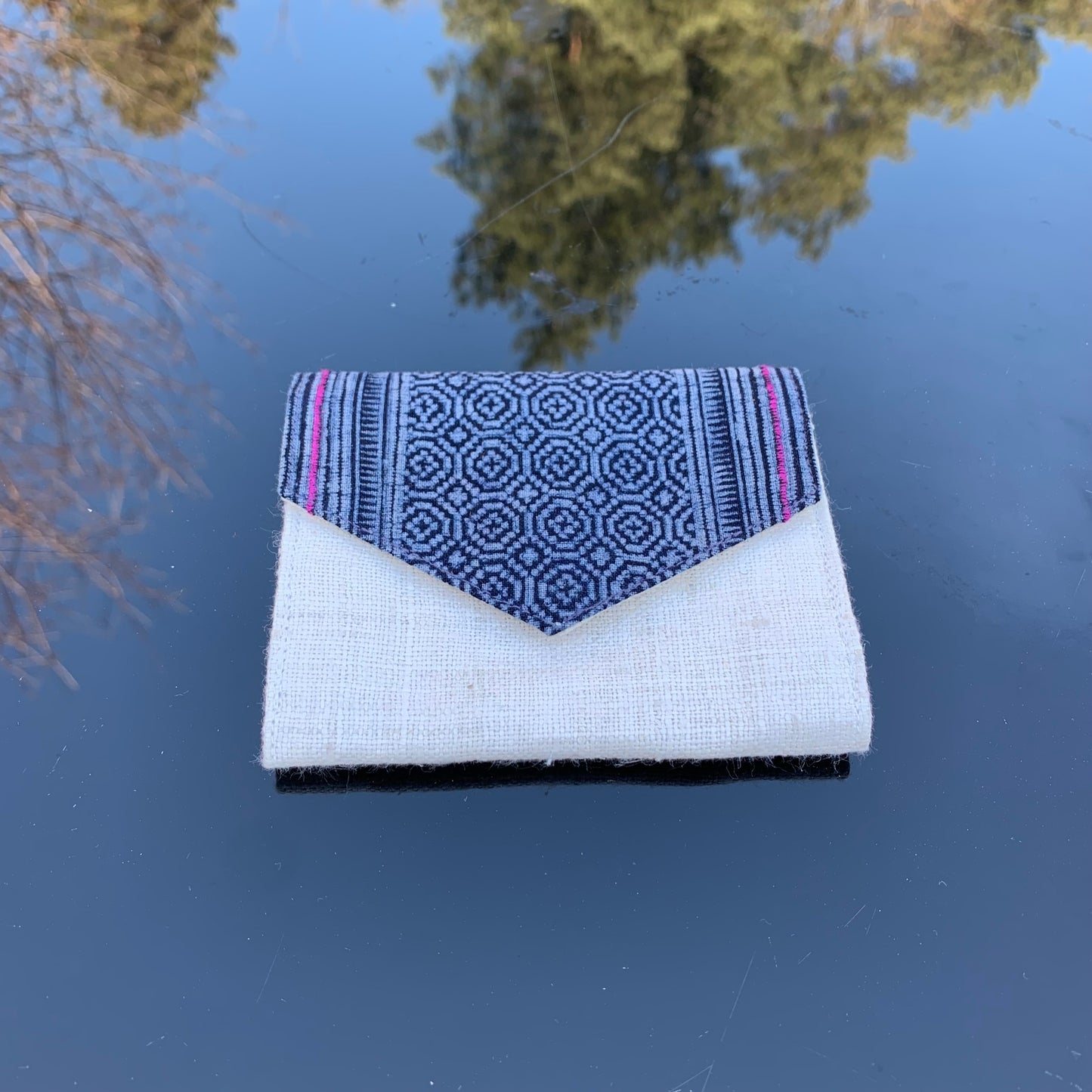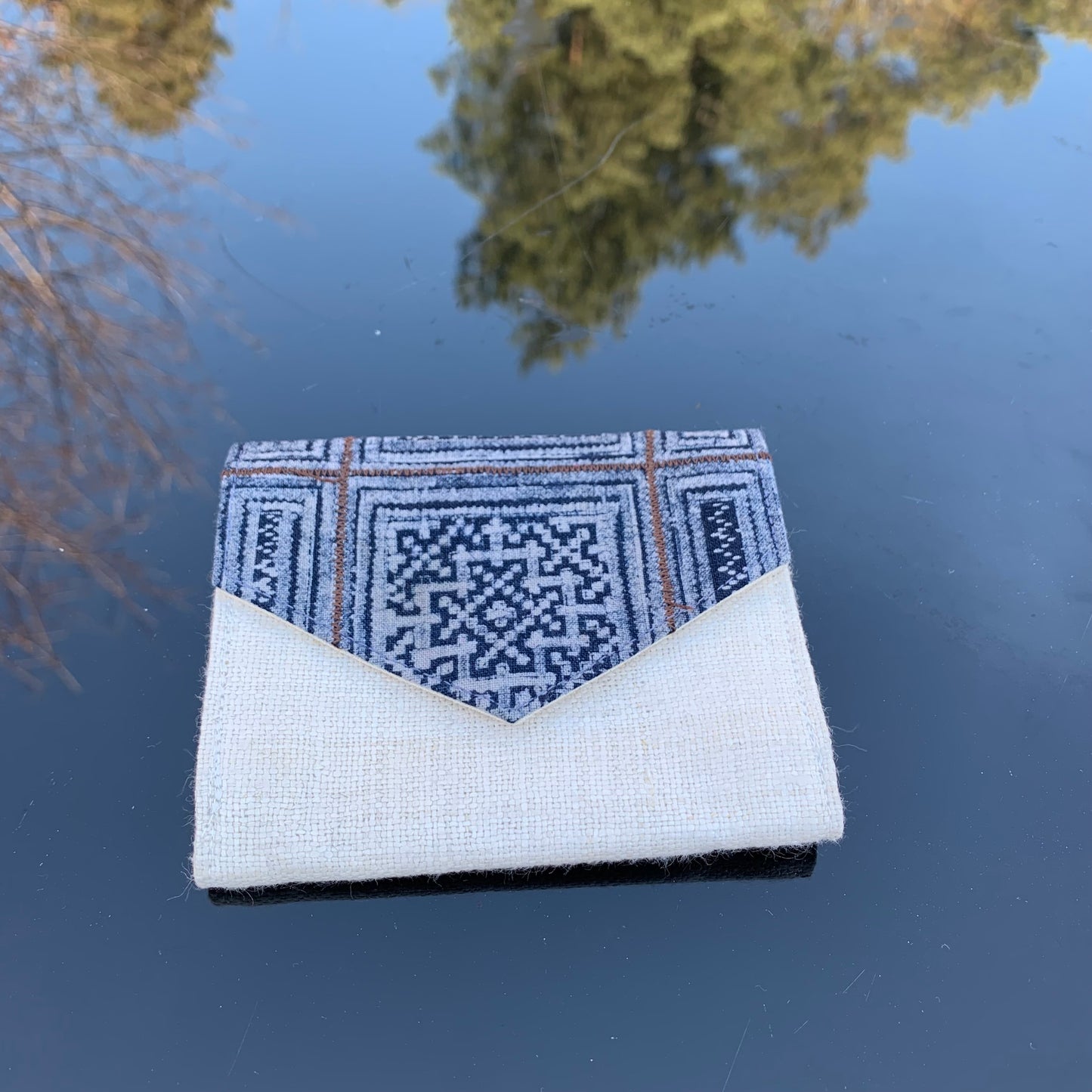 - Plånbokens flik har ett autentiskt batiktyg skapat med traditionella H'mong-tekniker, inklusive bivaxteckning, naturlig indigofärgning och sicksacksömnad med diamantformade lappar.